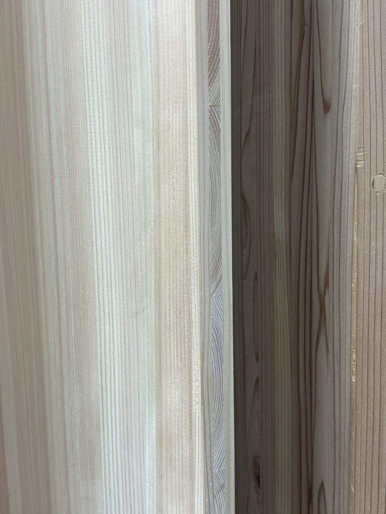 このCLTパネルの魅力は、まず断面の美しさにあります。従来のCLTでは、中間層に木の木口面が露出し、見た目が雑然としがちでした。しかし、MDFを採用することで、断面の中央がダークでスッキリとした均質なラインとなり、モダンで美しい印象を与えます。実物写真の比較です。ちょっと背景が同じヒノキで醜いですが、真ん中のラインの違いがわかるでしょうか。また、表面材にヒノキを使用している点も重要です。スギパネルと比べて木目が穏やかで、表面も硬いため、傷がつきにくいという高い実用性があります。目がうるさいスギや柔らかすぎる素材の欠点を解消した、見た目と使い勝手を両立した建材として、非常に注目されています。