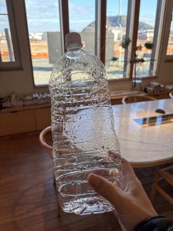 暖かい室内(22℃)に置かれた水ペットボトルを冷え切った屋外へ持ち出す。ガラスに水をかける。空になったペットボトルは数分もしないうちに、容器は外側から押し潰されたように「ベコッ」と音を立てて凹み始める。