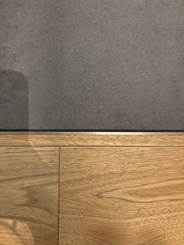 床の切り替えも、見どころの一つです。 重厚なタイルの冷たさと、フローリングの温かさ。本来、厚みも性質も全く異なるこの二つの素材を、寸分の狂いなくフラットに繋ぐのは容易ではありません。