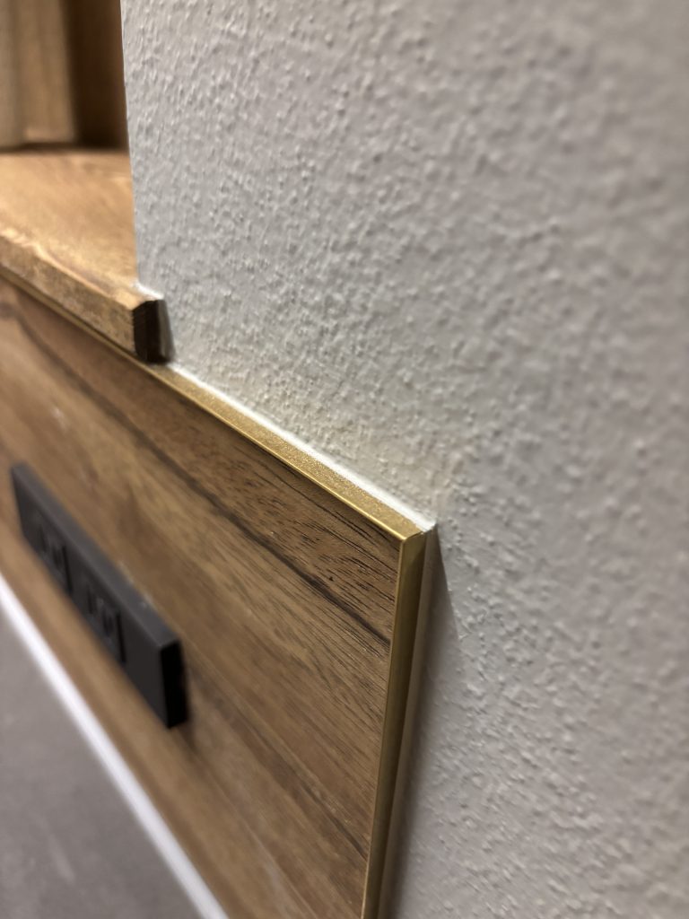 例えば、柔らかな質感の壁紙と、力強い木目のパネルが接する部分。そのまま突き付けてしまえば、どうしても断面のわずかな歪みや隙間が「ノイズ」として現れてしまいます。