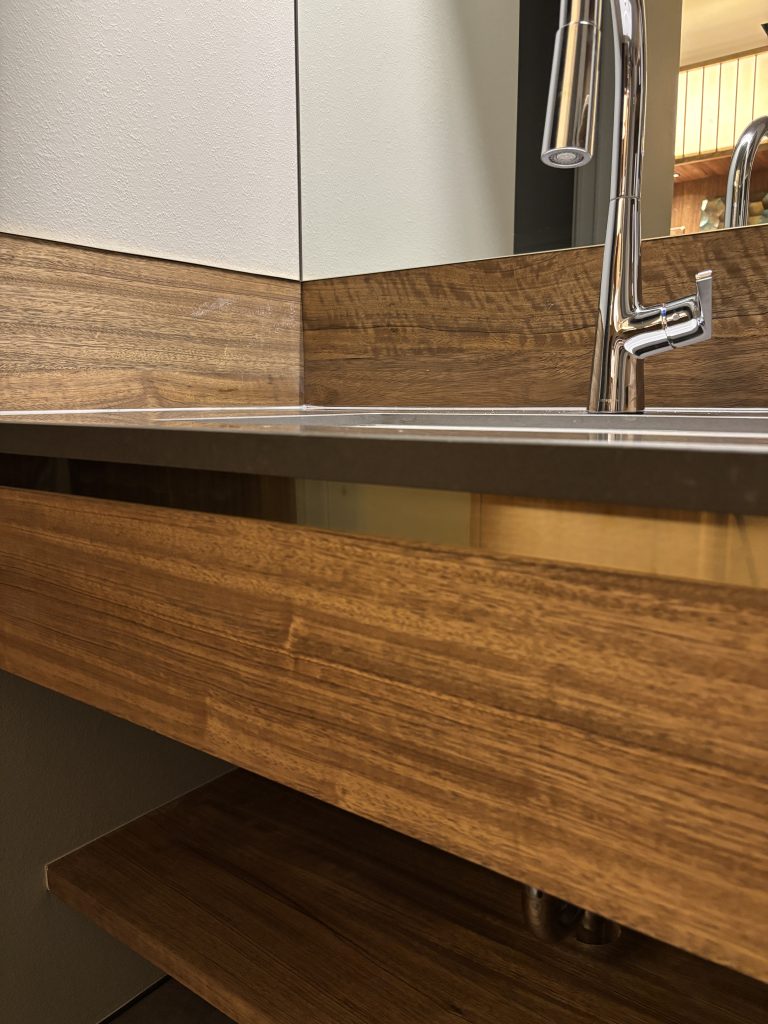 カウンターの天板と幕板の間に、細い暗がりのラインを走らせる。 影を置くことで、重たい素材に「浮遊感」が生まれ、空間に奥行きが宿ります。光を当てる場所だけでなく、あえて影をどこに落とすかを設計する。これこそが見切りの真骨頂と言えるでしょう。