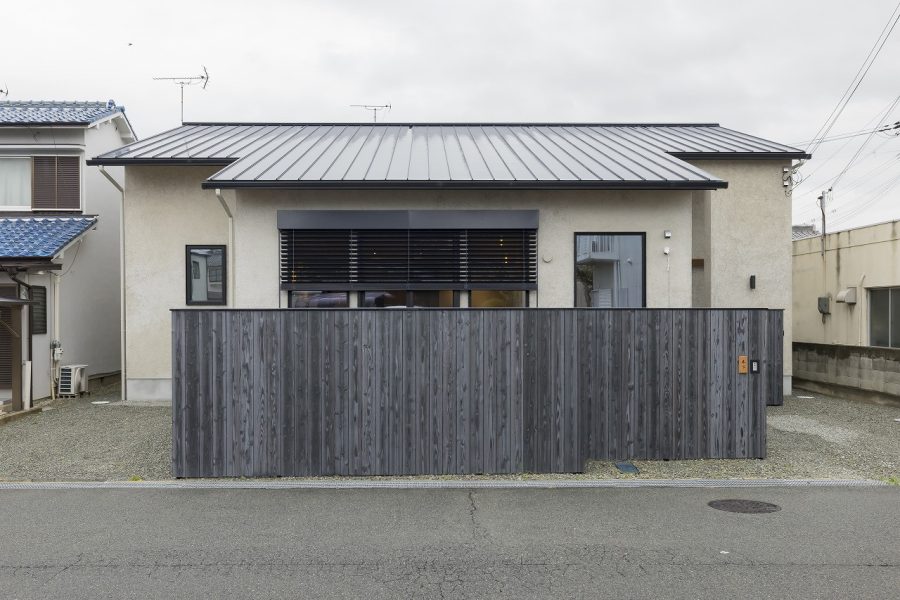 平屋のようなデザインの半2階建ての外観。板張りはブラックではなくグレーの外壁にあうよう若干のメタル調の焼き板塗装品を採用。経年で色が落ち着いてくるときが楽しみな素材。