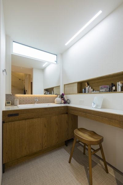 奥様こだわりの洗面。L字カウンターとし、洗面兼化粧台を兼ねている。収納はカウンターに乱雑にならないよう、普段使いのものと化粧品関係を全てしまえるようへこました壁に収納を設けた。