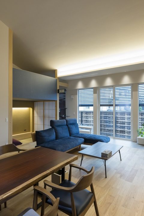 吹抜を活かし照明は間接照明とダウンライトでリズムを付け、天井にはあえて照明をなくしている。