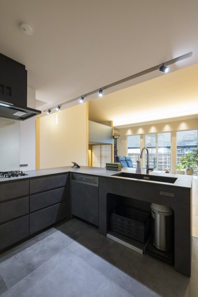 ご主人こだわりのフルオーダーキッチン。天板には熱や傷に非常に強いセラミック系のデクトンを採用。実際に熱い鍋を天板に直接おかれているようですが、汚れや傷が一切つかないとのこと。