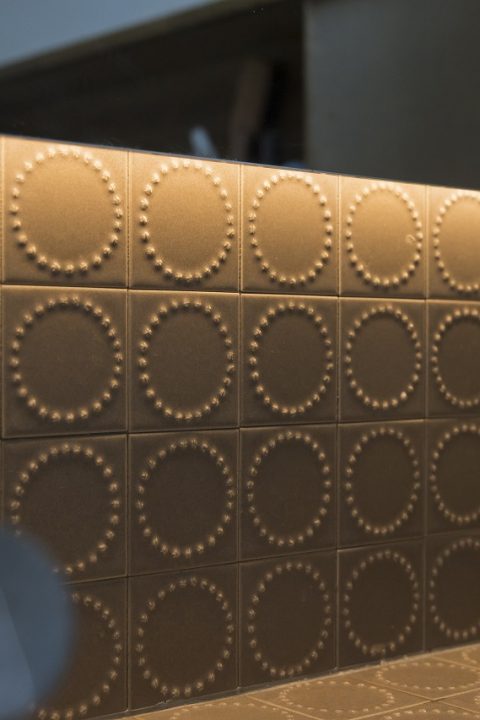 壁のタイルはお客様が実際に京都まで脚を運び吟味されたお気に入りのタイル。来客時に目を引くような間接照明も。