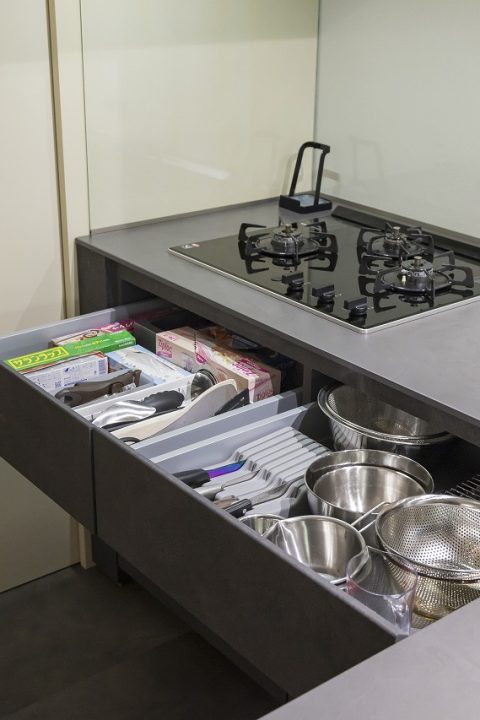 収納物に合わせた高さ設定で、無駄なく使える収納抜群の引き出し。今回料理にこだわりがあり、IHではなくガスコンロを採用。柄の入ったタイル等は好みでなく、建築物と一体感を出したかったのでコンロ壁には耐熱ガラスを貼っている。