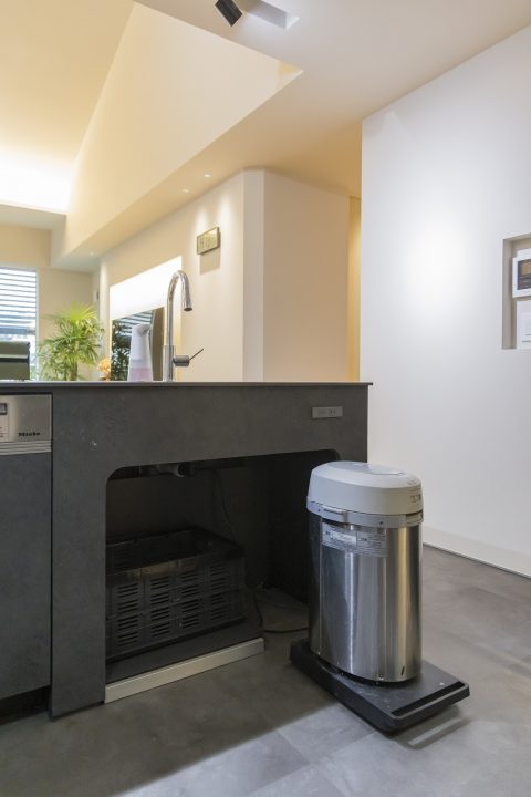 シンク下のスペースを利用して、生ごみ処理機を。キャスターを付け引き出して使えるような高さ設定。水栓は調理中に触りたくないということから、センサーやタッチ式ではなくフットスイッチを採用。