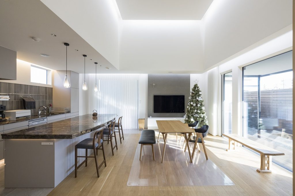 天井高約4.5mある、明るく洗練された上質な空間。天井照明は間接照明とすることでスッキリとした空間に。