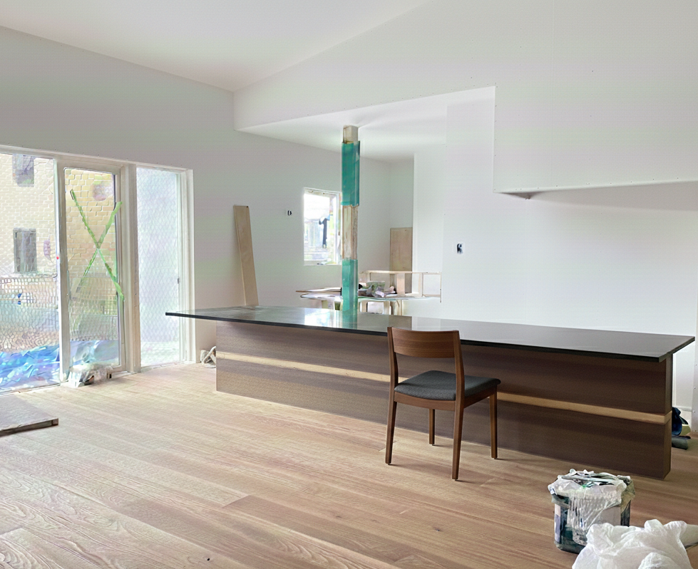 黒御影石と突板が織りなす、重厚なオーダーキッチンを設えた平屋